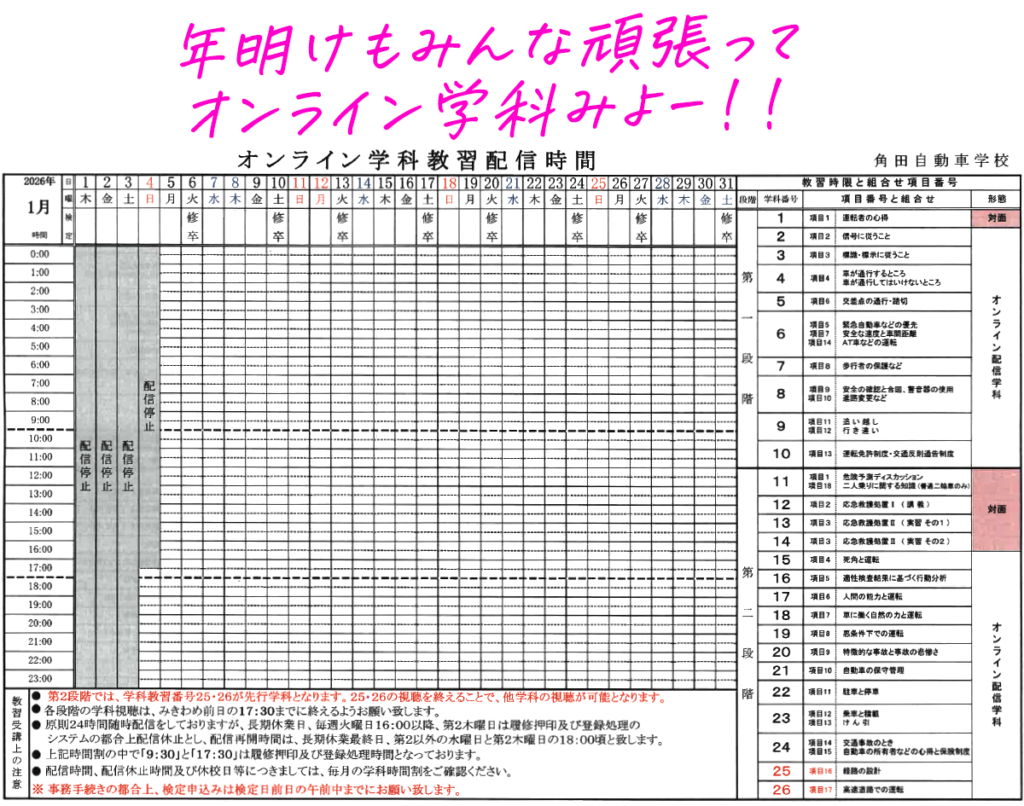 2026年1月オンライン学科教習配信時間表を掲載しました
